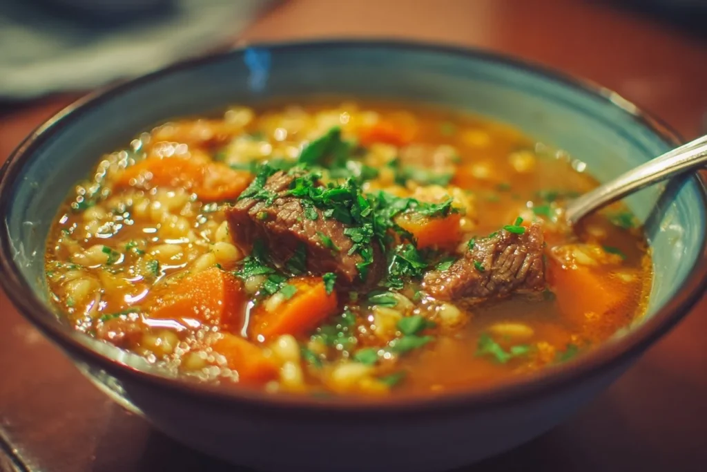 A nourishing and hearty soup combining tender beef, nutty barley, and wholesome vegetables, perfect for family gatherings.