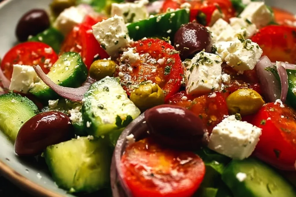 A refreshing and vibrant salad featuring fresh vegetables, olives, and feta cheese, drizzled with a simple vinaigrette, perfect for any occasion.