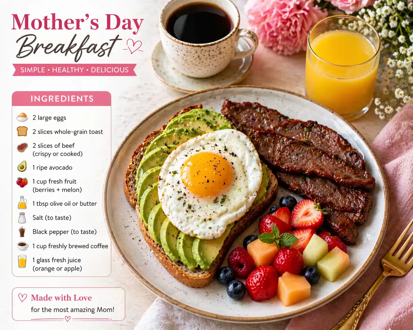 Creating a Mother’s Day breakfast is a beautiful way to express love and appreciation. The simple act of preparing a meal can convey deep sentiments and strengthen family bonds. The joy of seeing your mother enjoy a heartfelt breakfast makes all the effort worthwhile. Try this recipe and enjoy the special moments together.