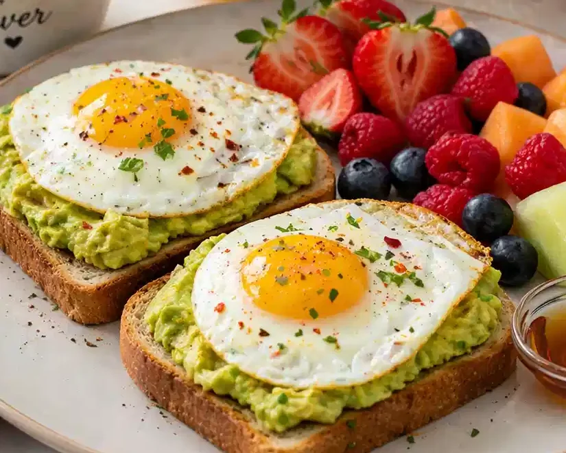 - Slice the avocado in half, remove the pit, and scoop the flesh out with a spoon. Cut it into slices and arrange them beautifully on the plate next to the toast. You can sprinkle a bit of salt or lemon juice for added flavor if desired.